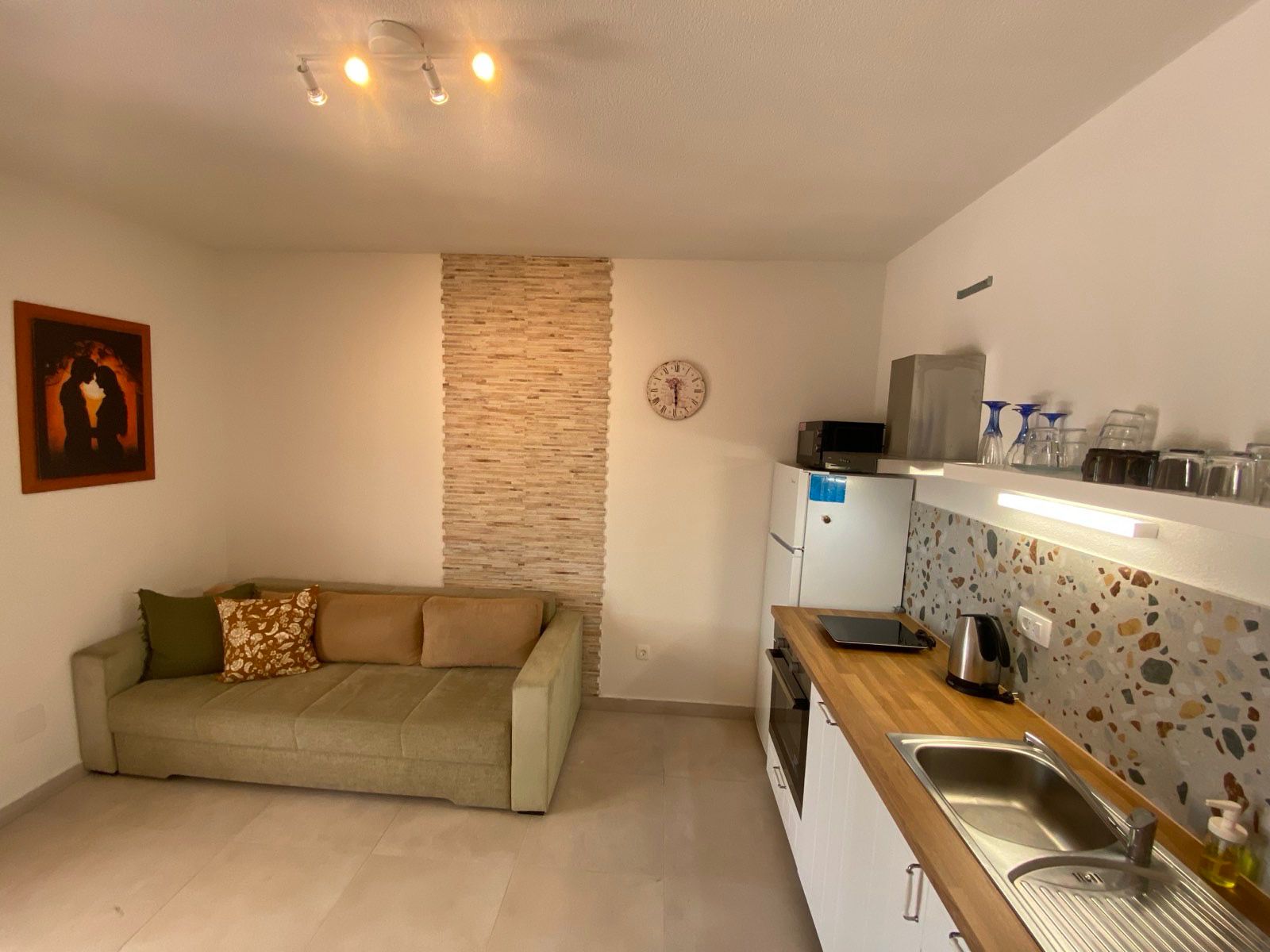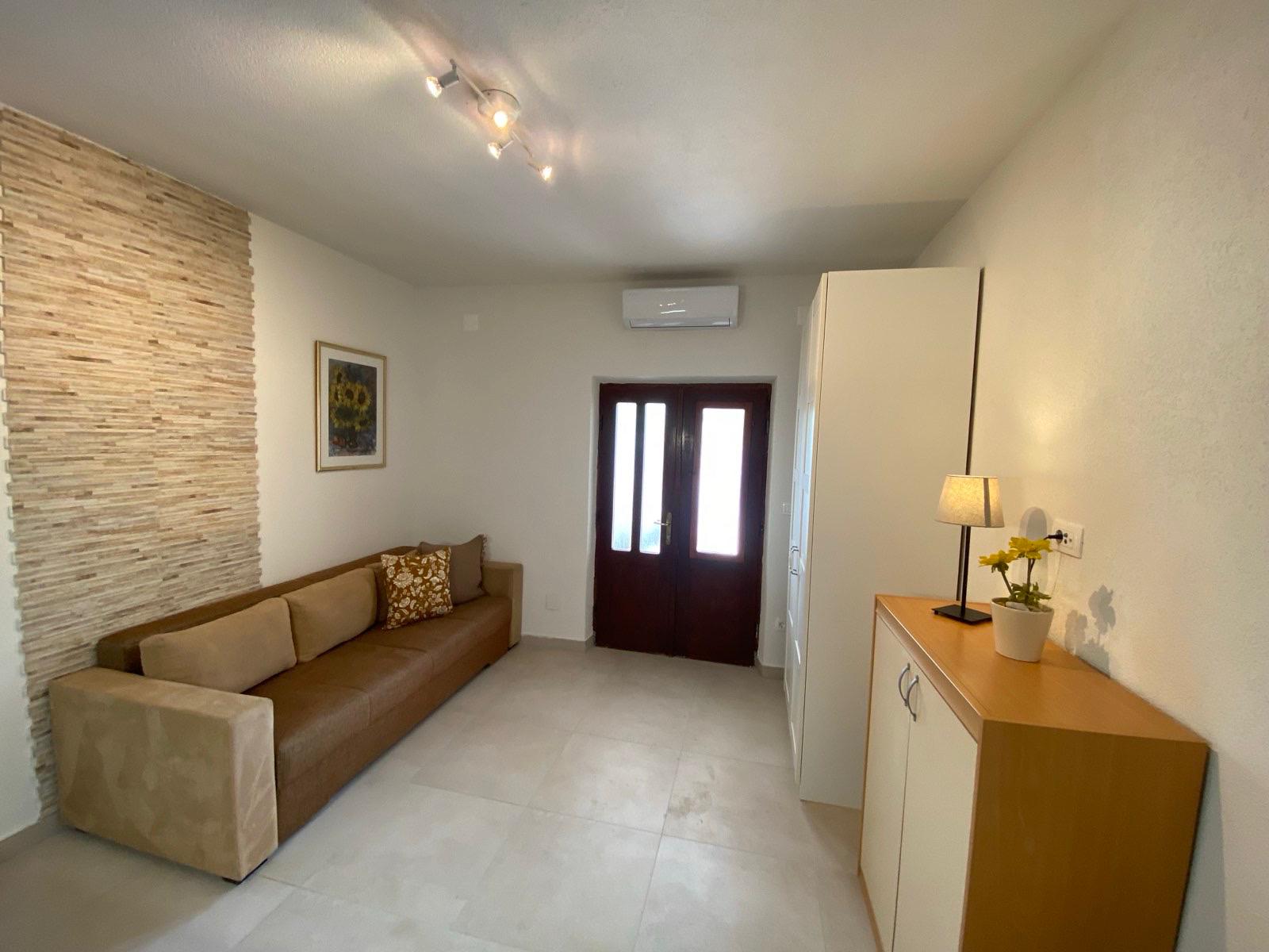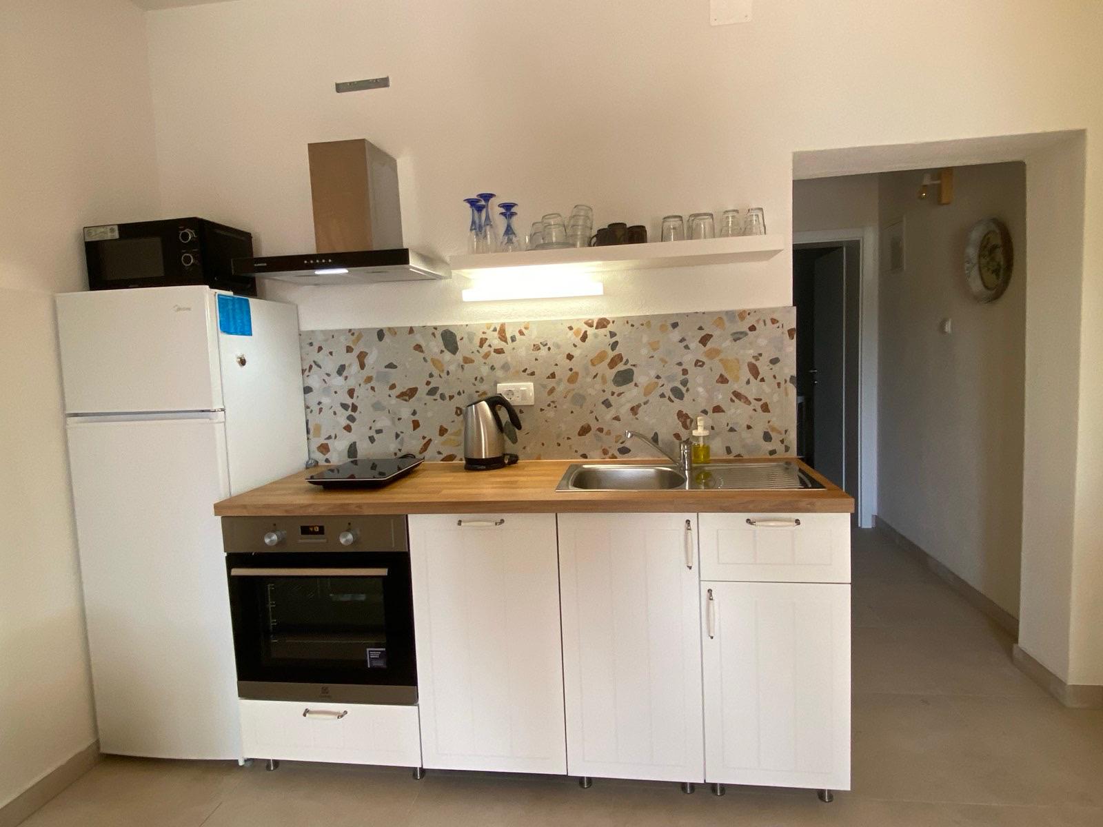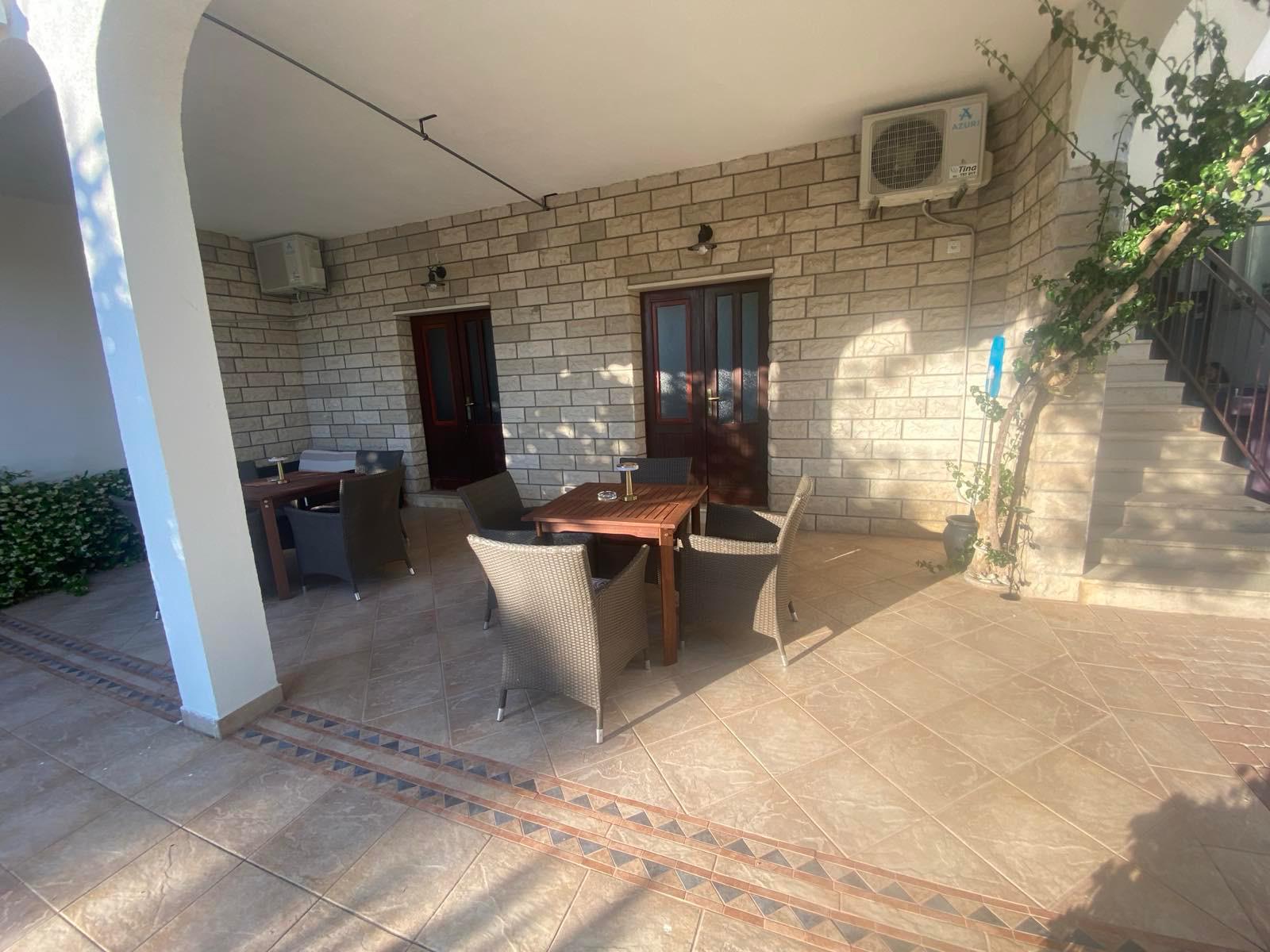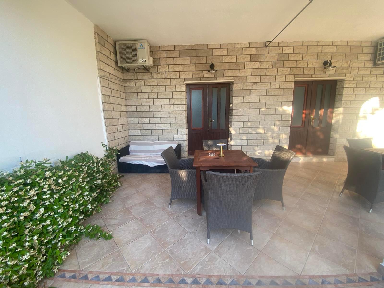 Modernizovaná vila se nachází přímo u moře, na pěkné městské promenádě. Byty s terasou v přízemí jsou kompletně modernizované, včetně vybavení. Kuchyňská část, základní vybavení -nádobí, vařič, lednice, myčka. Nová koupelna, vlastní soc. zařízení. Klimatizace, připojení wifi. Parkování je v blízkosti domu.